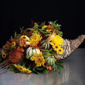 Why not send this to someone you wish to express your "Thanks" for? A beautiful Cornucopia of Fall leaves, gourds, mini cord, pincushion protea and other seasonal flowers and greens. Perfect as a centerpiece or gracing and entryway.